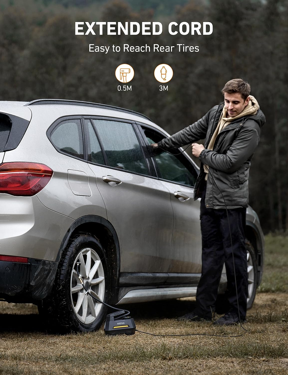 BUY WITH CONFIDENCE: Gifts for men women. Easily stow the compressor away in your car or garage and it will be ready to use at a moment’s notice. Package includes 1* digital air compressor, 1* Replacement Fuse, 2x Air Nozzle Cones, 1* Needle Valve Adapter 1* Presta to Schrader Adapter, 1* Extension Hose Coupling, 1* User Manual; If you have any questions or concerns, please feel free to contact us.