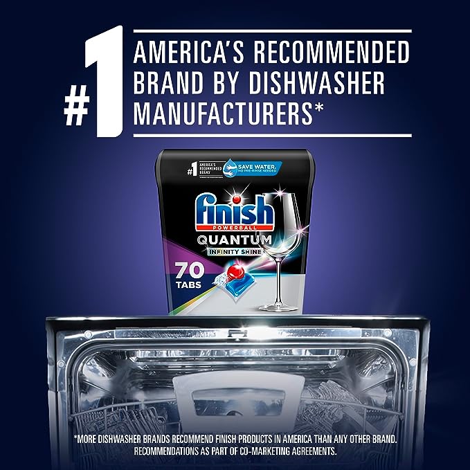 The new Finish Quantum Infinity Shine gives you our best ever clean and shine. Three separate fast-dissolving chambers deliver three power actions: break down and lift toughest messes, grease cutting power, and a finishing boost of shine. The three separate chamber tab delivers the cleaning power of an overnight soak, scrubbing away even 24-hour dried on food. Advanced powder with bleach seeks out and cleans tough stains like tea and coffee. No need to pre-soak or pre-rinse. This formula cleans in short cycles and provides glass protection. Our quick dissolving tab washes away residue for an amazing sparkling shine. Tub is recyclable. Remove plastic sleeve beforehand.