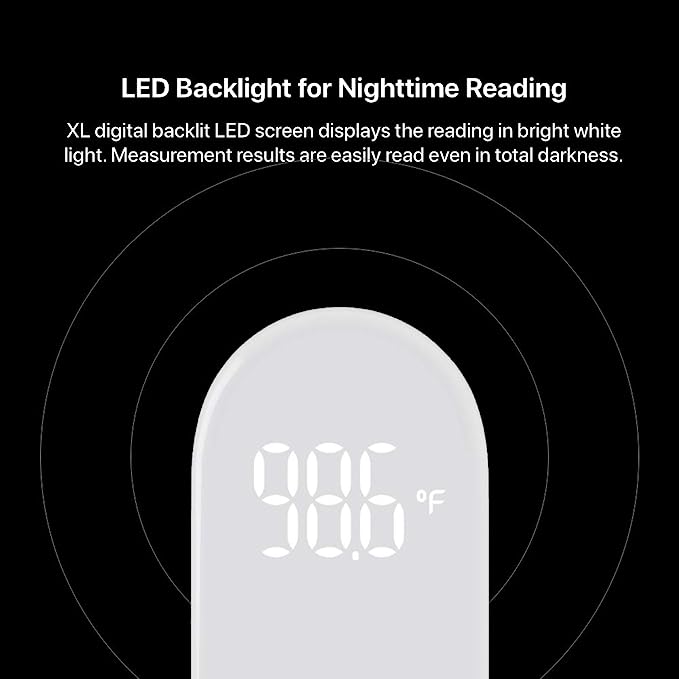 - Simple, Fast, Clear, And Quiet: With an intuitive single-button control design, the thermometer reads and shows the temperature in just one second on its easy-to-read, extra-large LED display, even in total darkness. When the temperature is read, the device gives a gentle vibration notification to the holding hand—no beeps or buzzes.